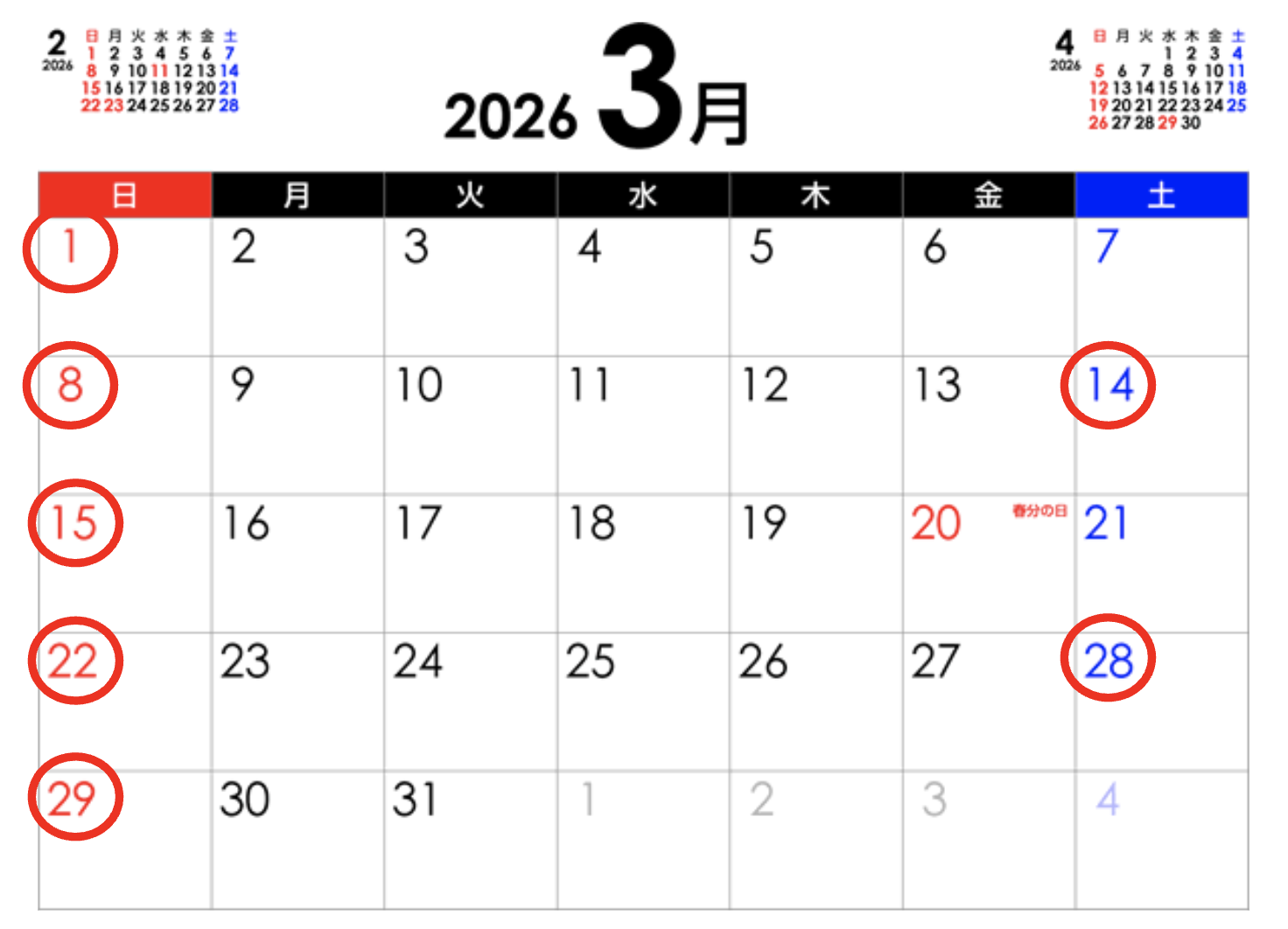 以下赤丸が休業日となります。